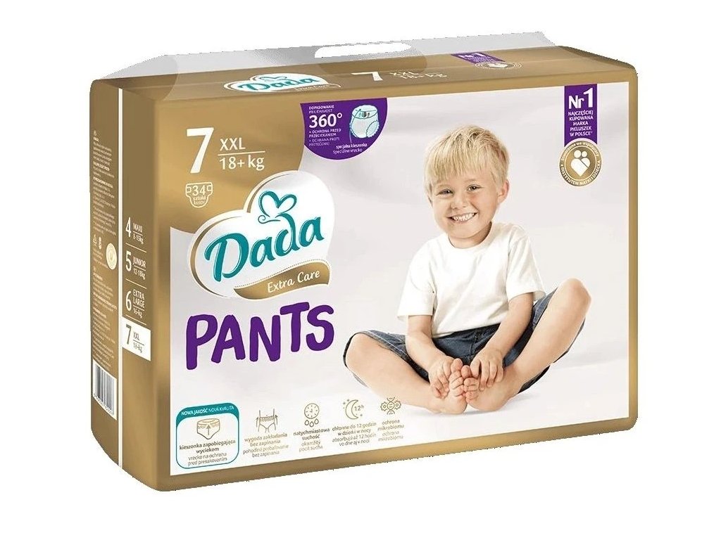 Dětské jednorázové pleny Dada PANTS Extra Care 7 jsou pro děti od 18+ kg. Balení obsahuje 34 ks.