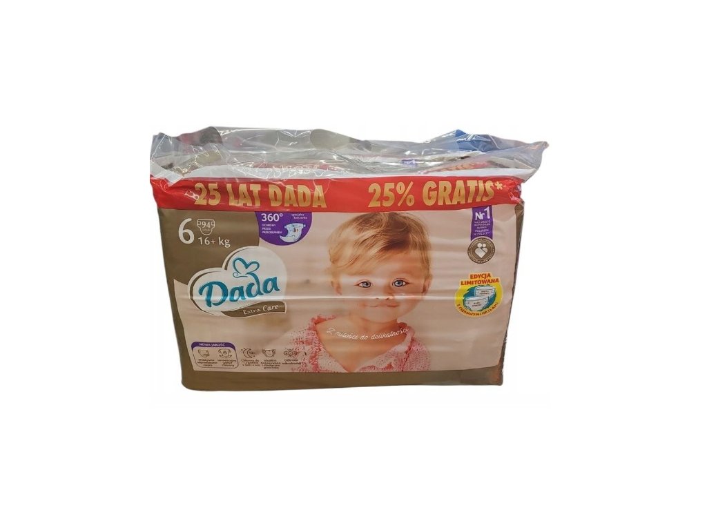 Dětské jednorázové pleny Dada Extra Care Jumbobag 6 jsou pro děti od 16+ kg. Balení obsahuje 94ks.