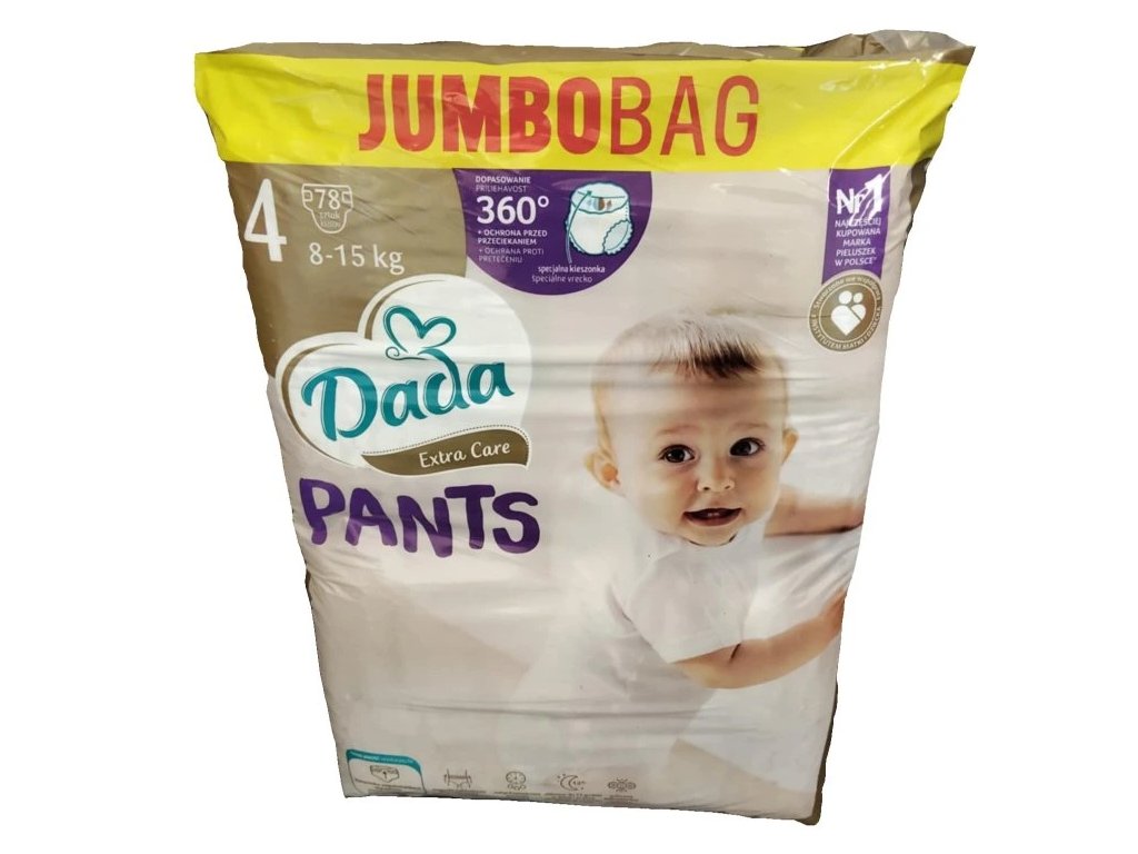 Dětské jednorázové pleny Dada PANTS Extra Care 4 Jumbobag jsou pro děti od 8 kg do 15 kg. Balení obsahuje 78ks.
