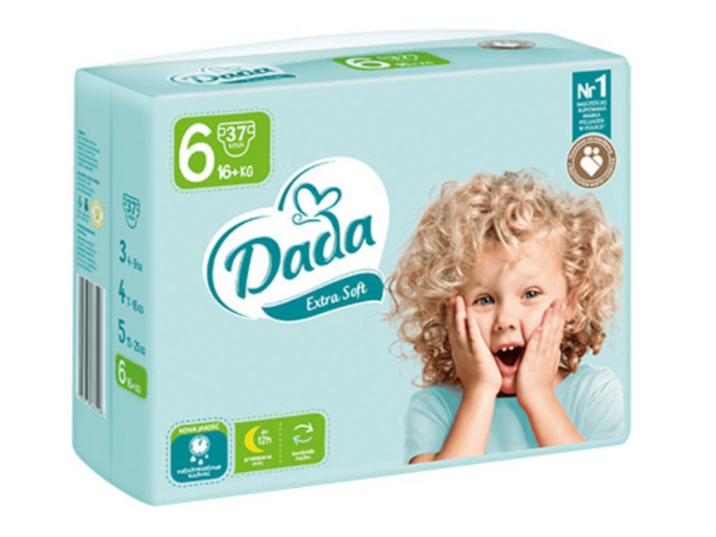 Dětské jednorázové pleny Dada Extra Soft 6+ jsou pro děti od 16+ kg. Balení obsahuje 37 ks
