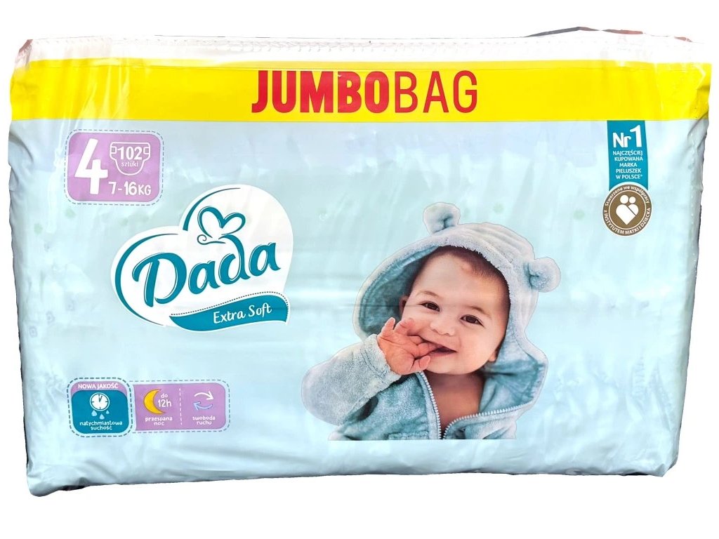 Dětské jednorázové pleny Dada Extra Soft 4 Jumbo bag jsou pro děti od 7 kg do 16 kg. Balení obsahuje 102 ks