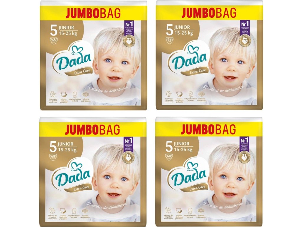 Dětské jednorázové pleny Dada Extra Care 5 Jumbobag jsou pro děti od 5 kg do 15 kg. Balení obsahuje 4x 68 ks (272ks).